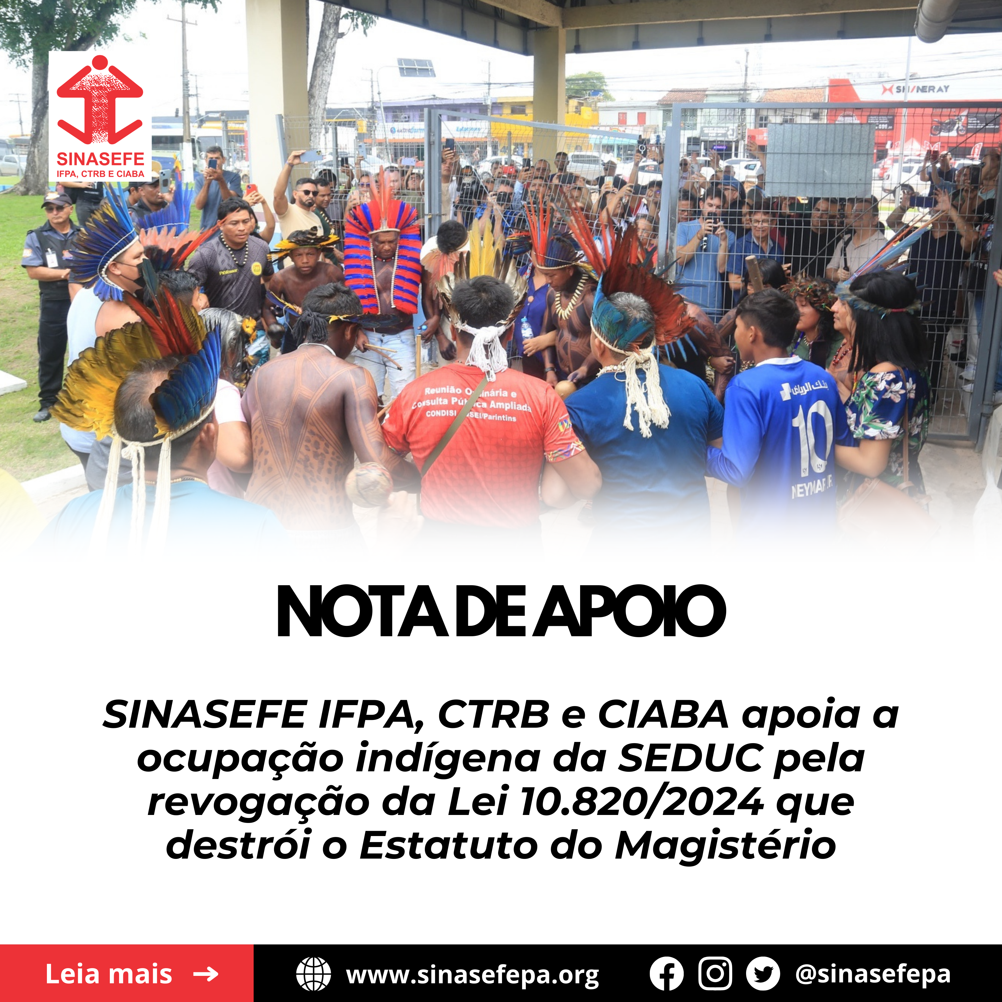 Desde a manhã da terça-feira (14), lideranças, educadoras e educadores indígenas do Pará, das etnias Borari, Munduruku, Tembé, Xikrim e Arapium, ocupam a sede da Secretaria de Educação do Estado do Pará (SEDUC) pela revogação da Lei 10.820/24, aprovada no final de 2024, que gerou inúmeros retrocessos ao magistério estadual, inclusive com o fechamento de … Continue lendo SINASEFE IFPA, CTRB e CIABA apoia a ocupação indígena da SEDUC pela revogação da Lei 10.820/2024 que destrói o Estatuto do Magistério do Pará. Agora é Greve!