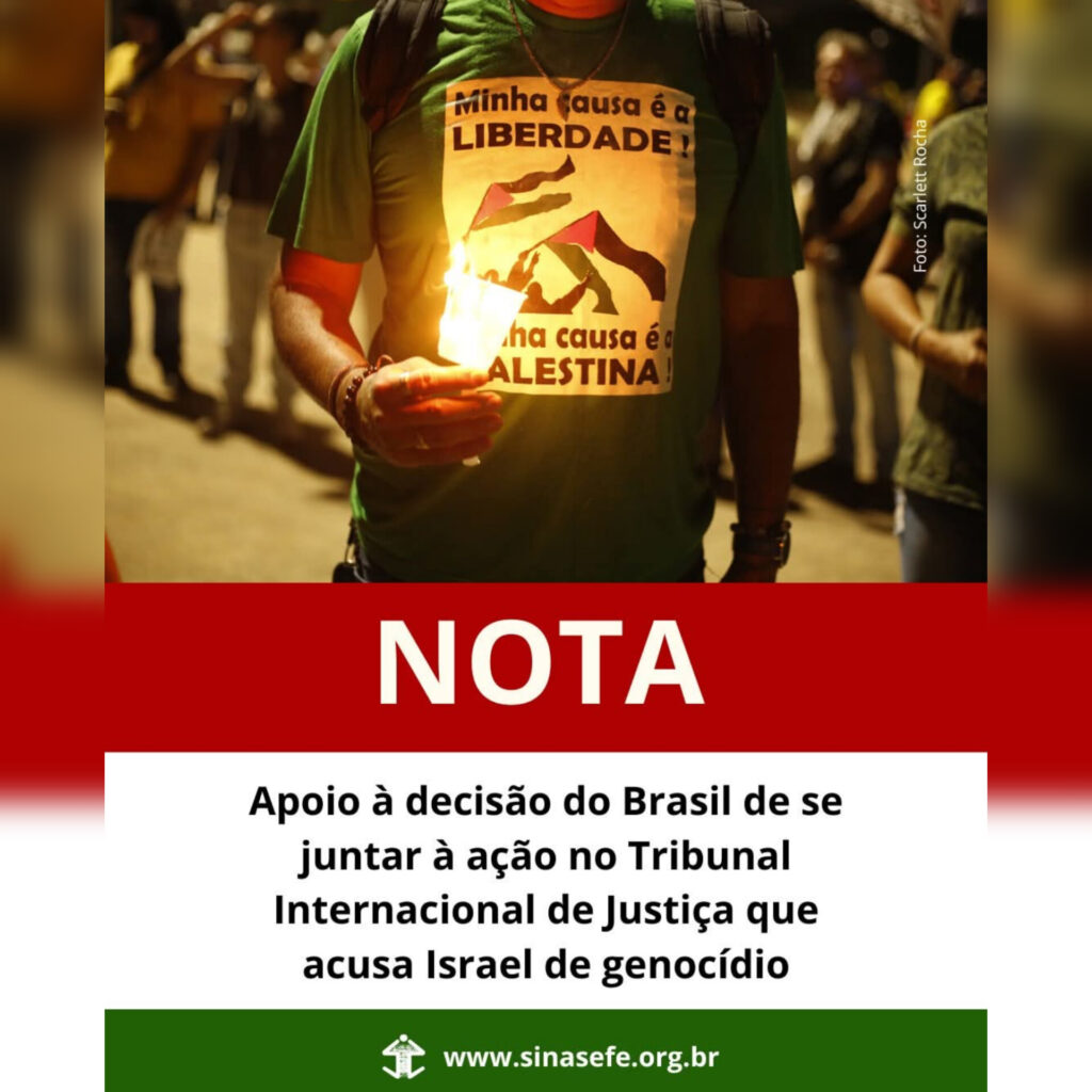 O SINASEFE apoia, com profunda convicção, a decisão do Brasil de se juntar à ação no Tribunal Internacional de Justiça (TIJ), principal instância judicial da Organização das Nações Unidas (ONU), promovida pela África do Sul, que acusa Israel de genocídio contra o povo palestino.