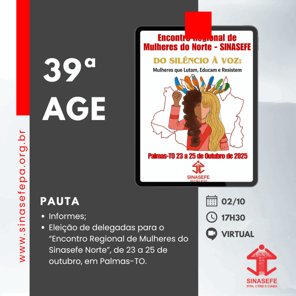 A Diretoria Executiva do SINASEFE IFPA, CTRB e CIABA convoca as mulheres eleitas nas Assembleias Locais (AL) para a 39ª Assembleia Geral Estadual Extraordinária, marcada para 02 de outubro, com última chamada às 17h30, em formato remoto, pela plataforma Zoom.