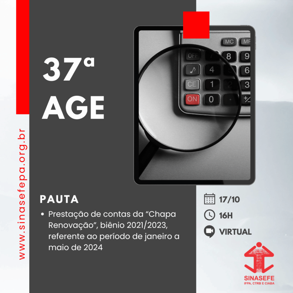 O SINASEFE IFPA, CTRB e CIABA convoca Assembleia Geral Estadual continuada de Prestação de Contas para o dia 17 de outubro, com última chamada às 16h, em formato remoto pela plataforma Google Meet. O objetivo é apresentar os demonstrativos financeiros do período de janeiro a maio de 2024, últimos meses de gestão da “Chapa Renovação – biênio 2021/2023, e submetê-los à aprovação da categoria.