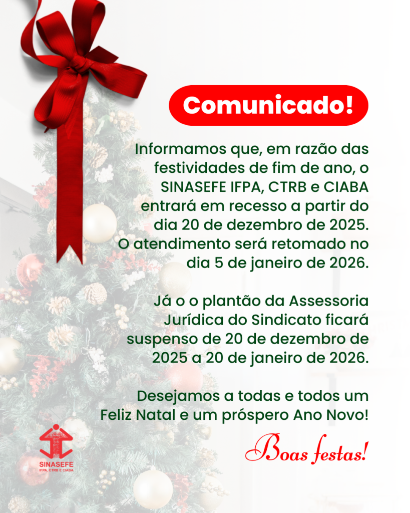 O SINASEFE IFPA, CTRB e CIABA informa que, devido às festividades de final de ano, entrará em recesso a partir do dia 20 de dezembro de 2025. O atendimento será retomado no dia 5 de janeiro de 2026. Já o plantão da Assessoria Jurídica do Sindicato ficará suspenso de 20 de dezembro de 2025 a 20 de janeiro de 2026. O período corresponde à suspensão de prazos processuais no Poder Judiciário.