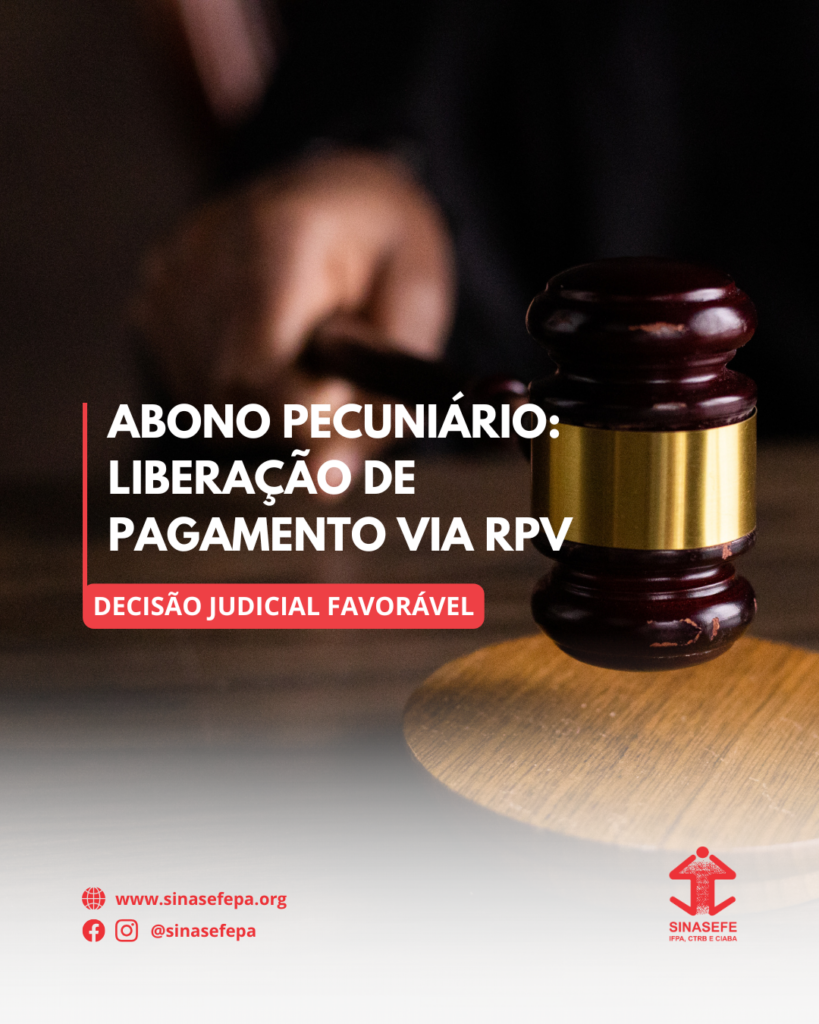 A Diretoria Executiva do SINASEFE IFPA, CTRB e CIABA informa que a ação judicial referente ao recebimento do abono pecuniário, decorrente da venda de 10 (dez) dias de férias, foi convertida em Requisição de Pequeno Valor (RPV) e já está liberada para saque.