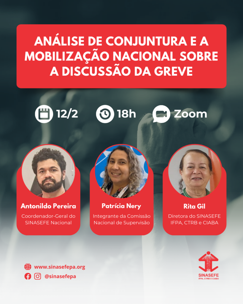 Quinta-feira, dia 12 de fevereiro, às 18h, a Seção Sindical IFPA, CTRB e CIABA vai promover, de forma remota, a live “Análise de conjuntura e a mobilização nacional sobre a discussão da greve”, com a participação do Coordenador-Geral do SINASEFE Nacional, Antonildo Pereira, e da integrante da Comissão Nacional de Supervisão (CNS), Patricia Nery.