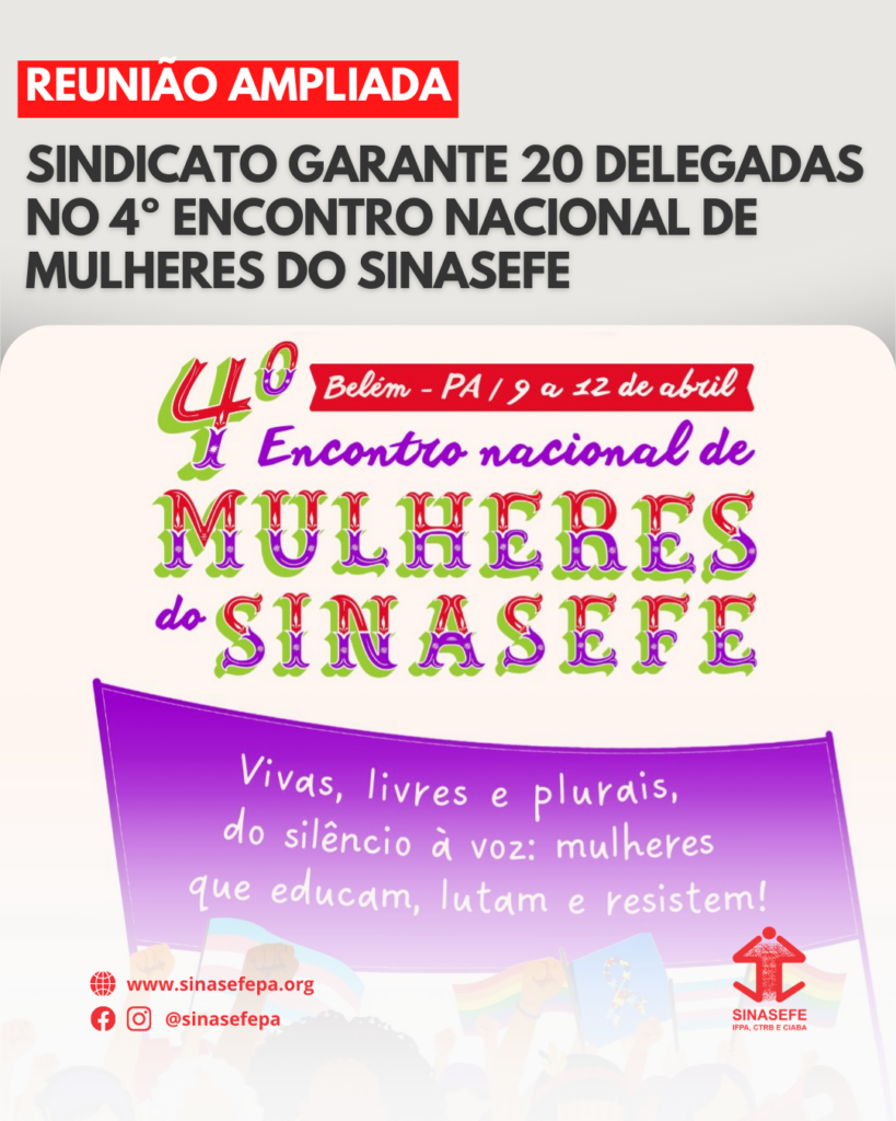 A diretora Rita Gil confirmou ainda que a Seção Sindical cumprirá a orientação da Coordenação de Políticas para Mulheres da Direção Nacional do SINASEFE, em conjunto com a Comissão Organizadora do evento, de custear hospedagem (exclusivamente na Casa de Apoio Antonieta de Barros – exceto para as sindicalizadas que residem em Belém), a taxa de inscrição, o deslocamento e o pagamento de diárias das participantes eleitas, bem como das crianças e adolescentes de até 17 anos no Sinasefinho.