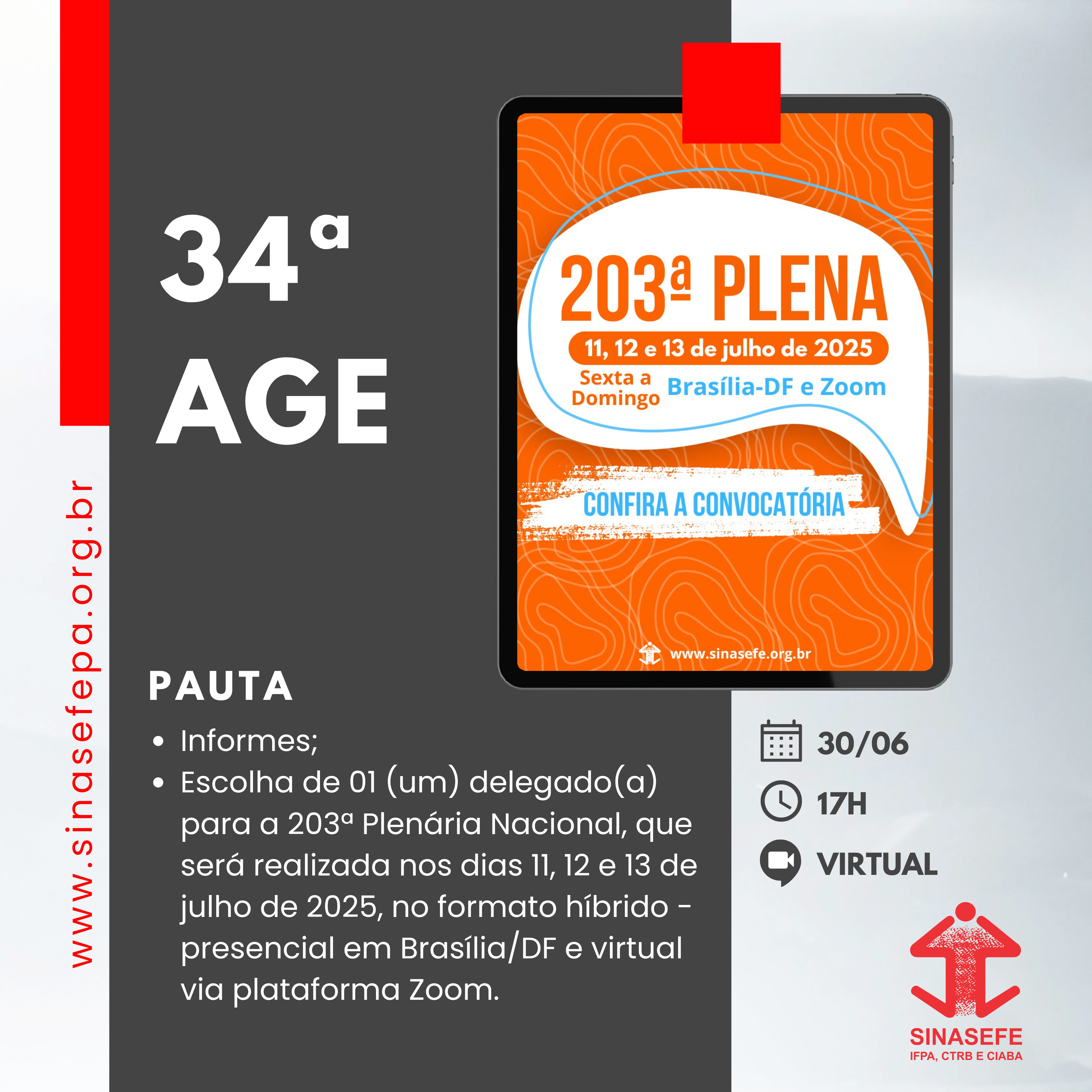 A Diretoria Executiva do SINASEFE IFPA, CTRB e CIABA convoca as delegadas e delegados eleitos nas Assembleias Locais (AL) para a 34ª Assembleia Geral Estadual